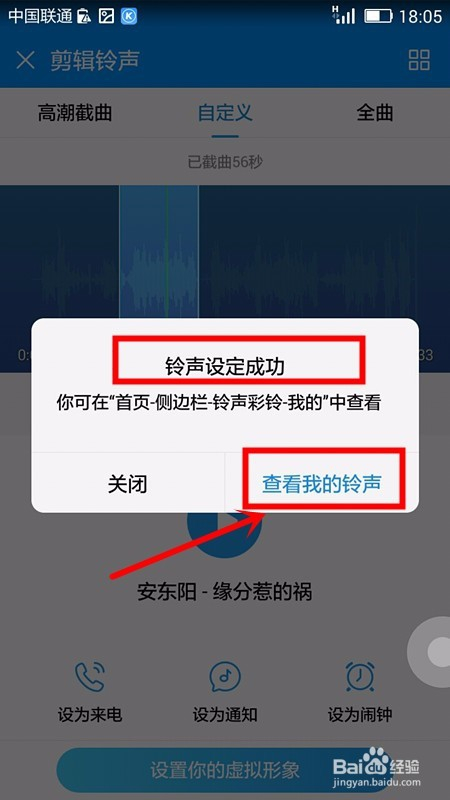 此时可以在手机页面上看到设定当作功的提醒框,我们可以选择查看我的铃声选项;