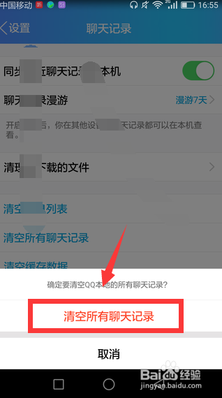 在底部跳出的选项框中,选择清空所有聊天记实,确定删除
