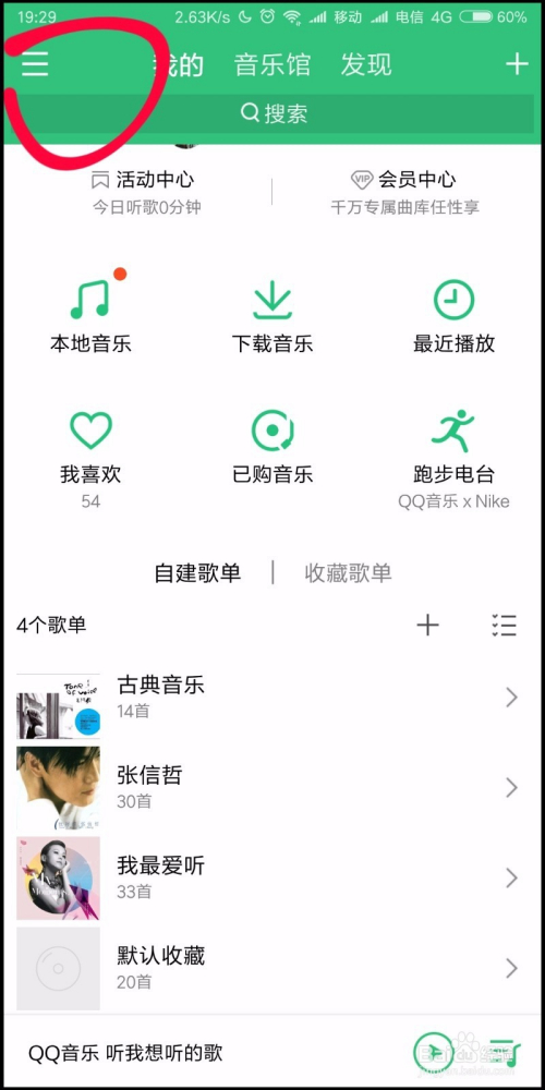 接着我们打开QQ音乐,点击左上角的菜单图标,如下图所示。