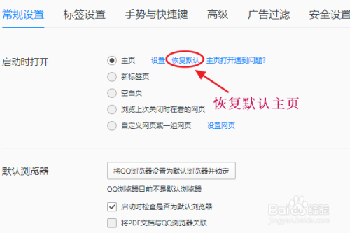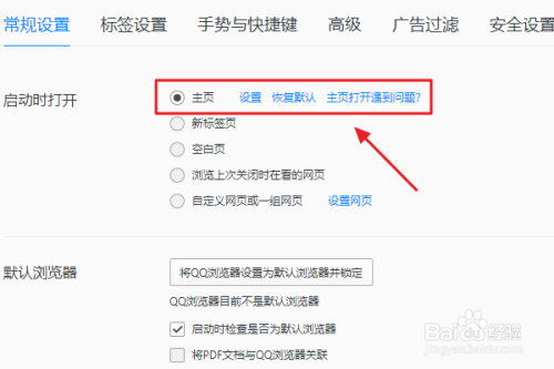 我们点击该窗口的“设置”,接着在常规设置里找到本家儿页选项,如下图;