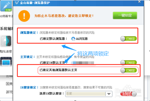 接着在弹出的浏览器防护窗口里,我们首先将QQ浏览器进行锁定,然后鄙人方对应的的本家儿页锁定里也将“已锁定”选项打开,如许根基上可以解决年夜部门的环境,如图所示...
