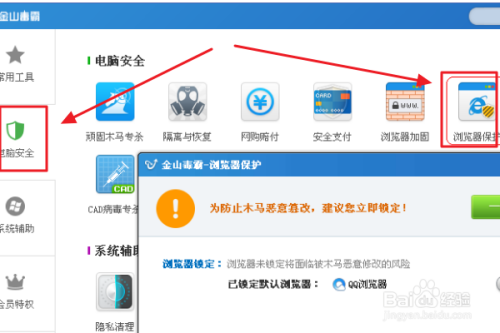 若是碰到的是比力顽固的被窜改环境,那么以上方式只能更改一次,下次打开电脑或者浏览器就又被窜改归去了,这种环境我们就要借助第三方专业的杀毒或者平安卫士东西了,这里小编介绍金山毒霸,打开它今后找到“浏览器防护”这一项,如下图所示...