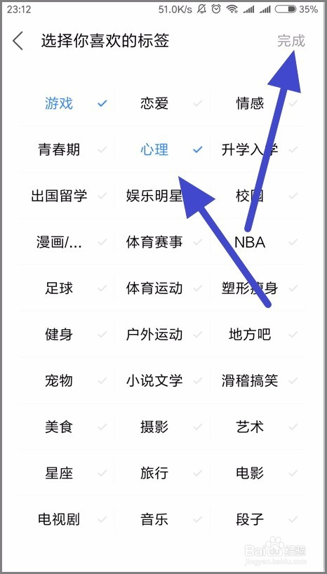 在乐趣设置页面,我们可以选择本身喜好的标签,然后点击右上角的完当作。