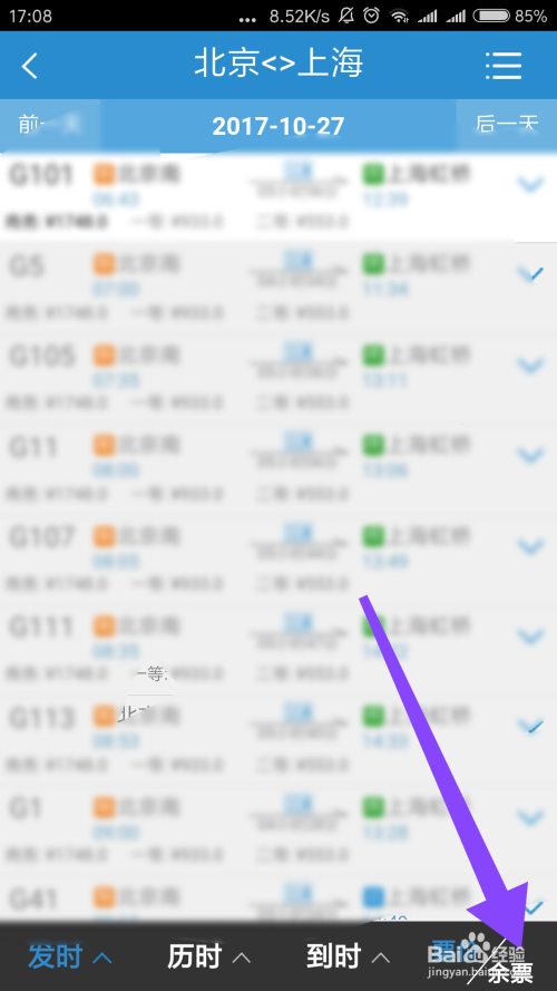接着我们跳转到查询的成果,然后点击右下角的余票按钮!