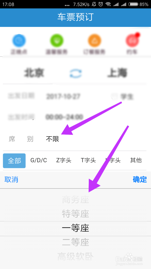 接着我们选择座位的类型,以及火车号的类型,这个可以按照我们本身的需要进行选择!选择完当作之后,点击下方的当即查询!