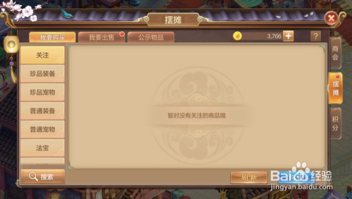 在摆摊界面,我们可以看到我要采办、我要出售、物品公示3个标签,我们点击“我要出售”。