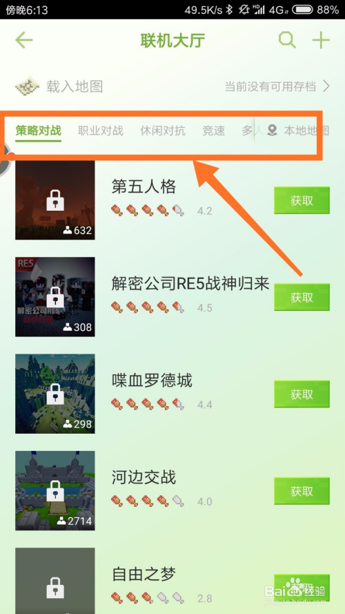 进入联机年夜厅后,有策略对战,职业对战,休闲匹敌等房间办事器,大师可以选择进入,点击获取即可,如下图所示
