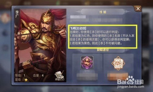 李广标的目的仇敌出杀时可以进行鉴定,若为红色,李广可以获得鉴定牌,若为黑色,李广出的杀不克不及被闪避,如许有技术可以包管有牌有输出。