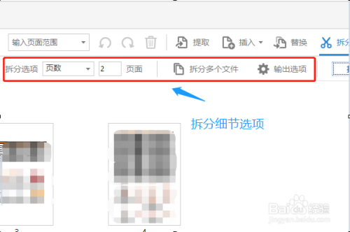 在缩列图右上角有一项“拆分”选项,点击今后就可以对今朝的文件进行拆分了,我们自行设定拆分的页数、拆分的文件个数等;