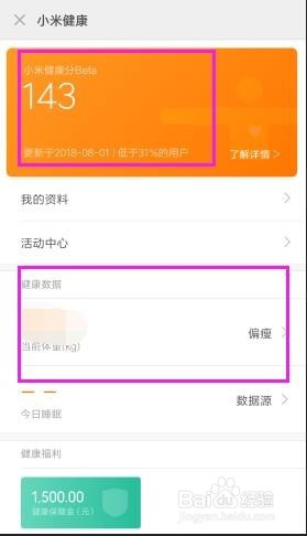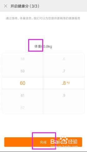 选择我们的体重。然后点击【完当作】。在健康页面,我们就可以看到预估得出的健康分等信息。