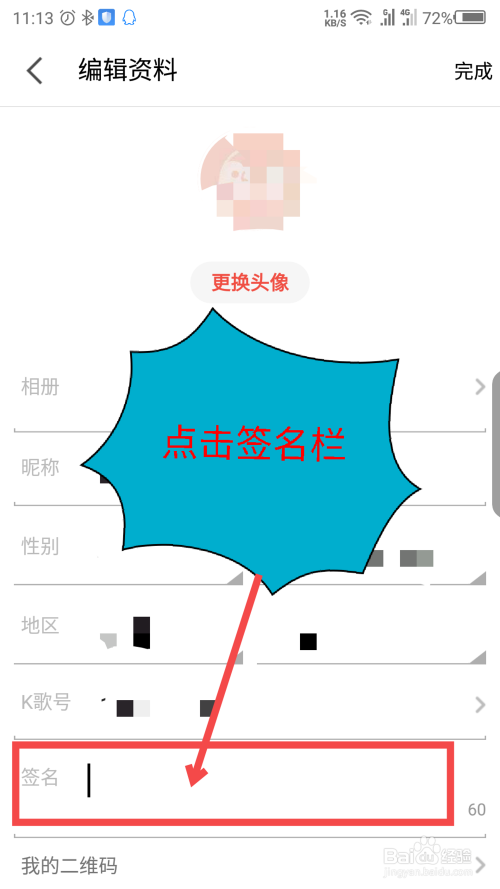 单击后打开编纂资料界面,我们也可以点窜其他的小我信息资料。点击签名一栏。