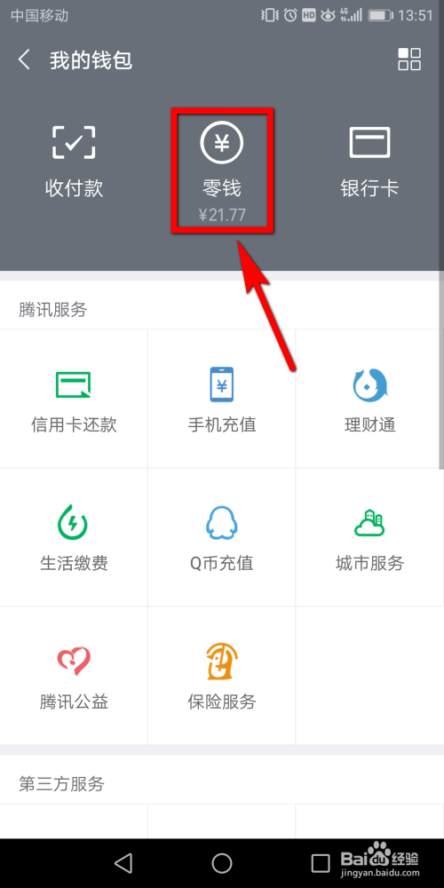 进入钱包后在页面顶部中心位置点击【零钱】图标,如图所示。