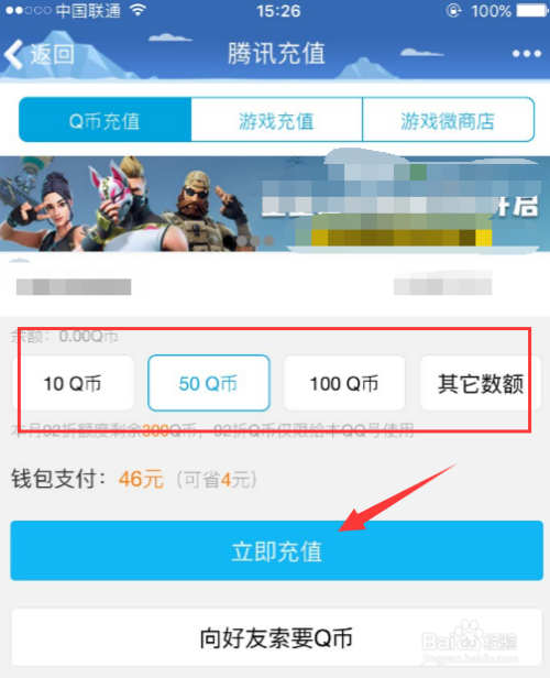 进入后,选择你要充值的Q币数目,并点击下方的当即充值,如下图示