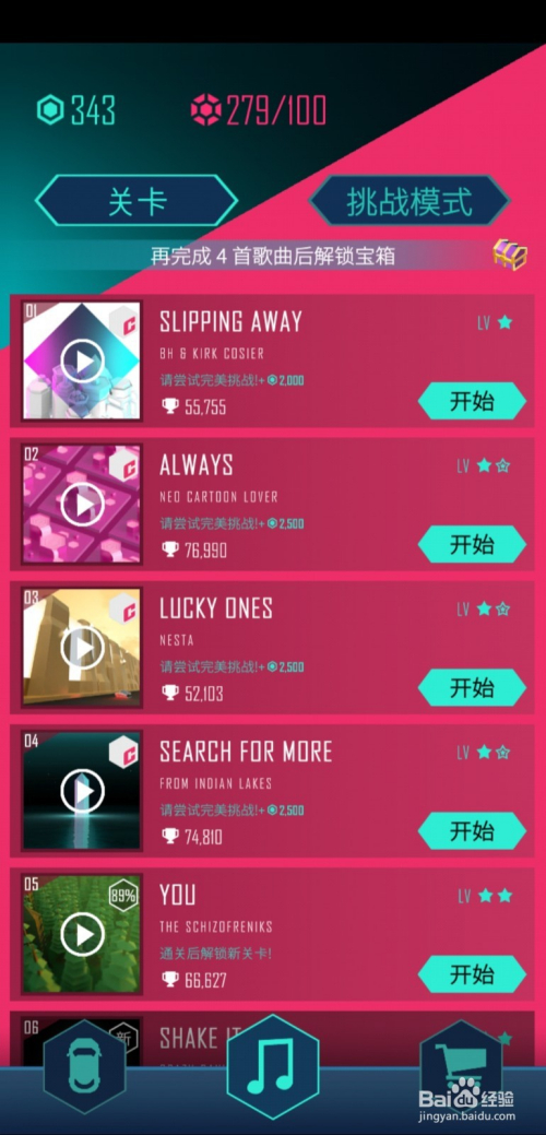 在这条目游戏中,每一个关卡都是分歧的音乐。分歧的音乐关卡的难度也是纷歧样的。必需经由过程之前的关卡之后,后面的关卡才会解锁!