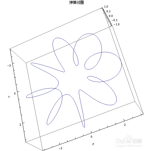 Sin[8 u]}, {u, 0, 2 Pi}, AxesLabel -> {x, y}, PlotLabel -> “弹簧线圈”]