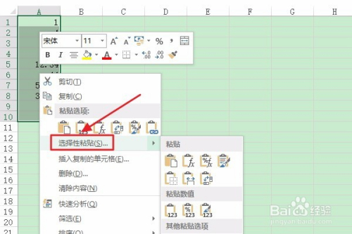 然后我们将适才新建的那组数字全数选中,然后点击鼠标右键选择“选择性粘贴”;