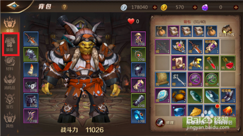 在背包中默认的是显示全数的物品,为了看清晰哪些装备可以淬炼,这里我们点击的【装备】。