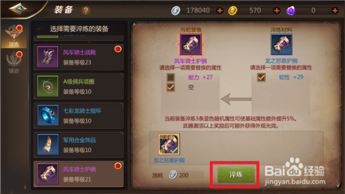 接下来会呈现我们穿戴的装备和要淬炼装备的属性,点击右上角的【淬炼】。