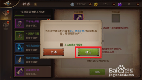淬炼当作功后这个装备若是没有随机属性了系统会给我们提醒,这时辰点击【确定】即可分化装备。