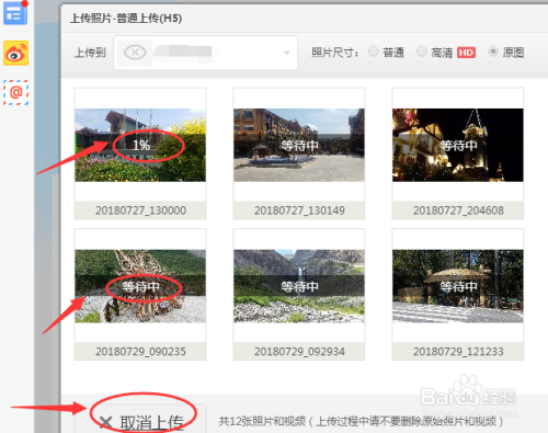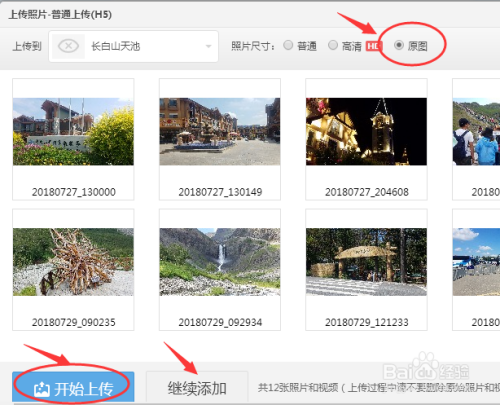 照片尺寸选择“原图”,如许画质不掉真,也可按照现实需要选择照片尺寸。若是照片添加完了,选择“起头上传”,若是还有想上传的图片,点击"添加照片",添加完当作后,点击“起头上传”。