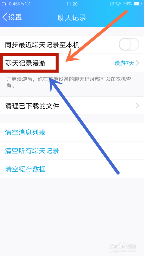 在聊天记实中,点击进入聊天记实漫游,此时设置的是漫游7天,如图所示