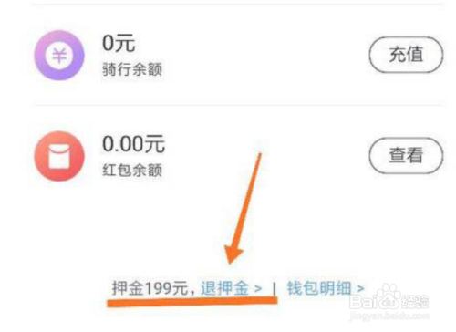 6.点击阿谁近似长方形的图标之后,进入【我的钱包】页面,在最下面可以看到一行字【押金199,退押金】,点一下这行字即可,如下图所示。