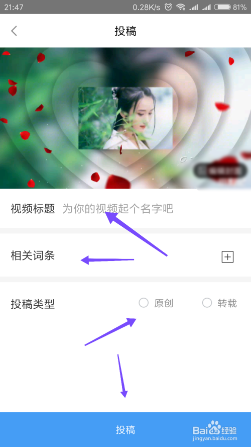 视频剪切完当作之后,我们可以给视频起一个名字,然后选择视频的相关词条,接着选择投稿类型,然后点击下方的投稿即可。