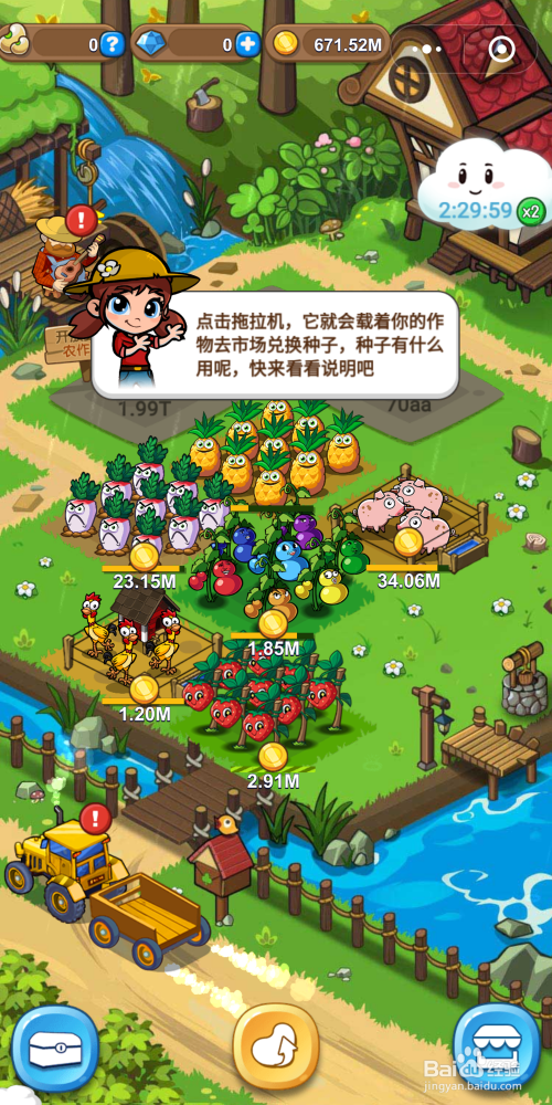 解锁多块地盘,达到必然收益后,会有拖沓机呈现。它会载着收割的作物去市场兑换种子。
