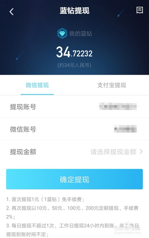 蓝钻可以微信或付出宝提现,1个蓝钻1元,初次提现1元免手续费,后续可以提10、50、100、200元,需要2%手续费。