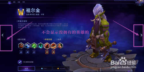 点击一个英雄进入,可以查看已拥有的具体信息,点击摆布可切换英雄(不会显示没有拥有的英雄的)