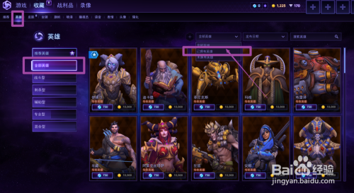 进入保藏后,点击选择【英雄】—【全数英雄】—右上角【已拥有的英雄】;如图所示