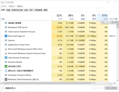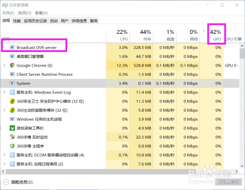 然后打开电脑上的资本办理器,可以查看到有一个法式占用高,就是Broadcast DVR service
