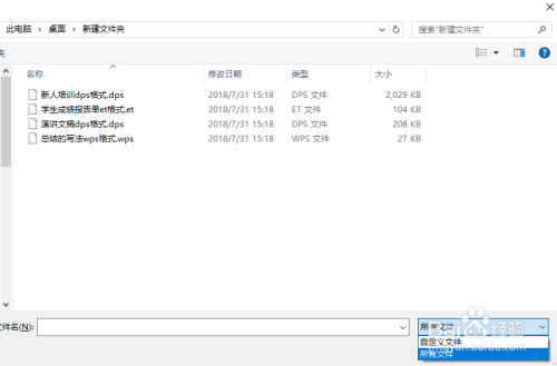 若是电脑里没有安装wps的话,打开路径,点击添加文件界面的右下角,将“自界说文件”点窜为“所有文件”;