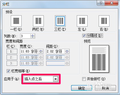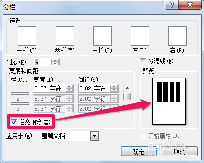当打消栏宽相等时,可以在上面调节每栏的宽度和间距。好比小编分当作四栏,将第二栏的宽度调小,成果如下图。