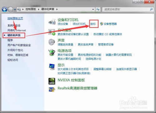 要调节鼠标指针大小我们需要打开鼠标的属性设置窗口,可以经由过程电脑节制面板中的硬件和声音下的鼠标图标点击进入。