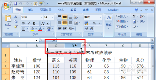 托的过程中就会看见D列显示出来了,用同样方式把C列也托出来。