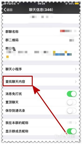 鄙人拉的菜单中,找到“查找聊天内容”按钮,点击打开进入下一步操作,如下图示。