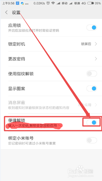然后在打开的页面中可以看到一个 便捷解锁 选项,它是处于封闭状况的;点击它后面的滑块,将它开启;如许就可以输入一次密码解锁全数应用了。