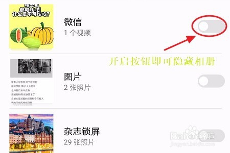 点击进入今后,我们点击右下角的“更多”-“埋没相册”,然后照片会有相册的形式揭示也就是按照类别显示,我们在每个相册后面将埋没的开关打开即可;