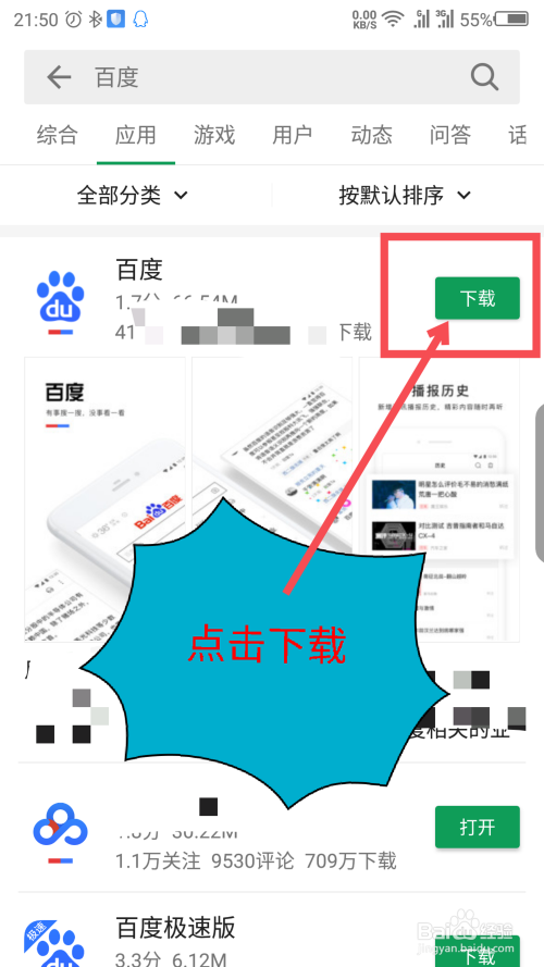 鄙人列搜刮的软件中,点击百度后面的下载选项。如下图所示