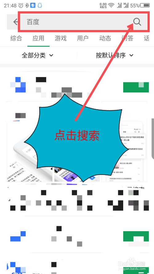 打开商铺后,点击最上面的搜索框,输入要搜刮的手机百度软件。如下图所示