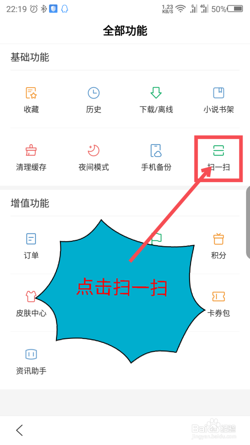 在全数功能里面分根本功能和增值功能,在根本功能里面,最后一个选项就是扫一扫功能,点击扫一扫。操作如截图所示
