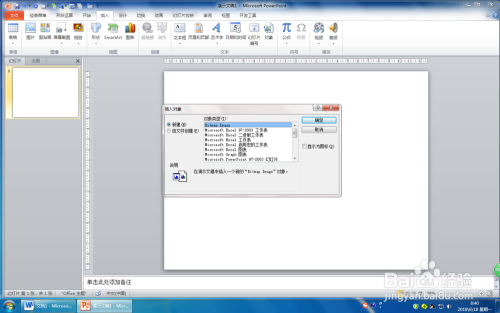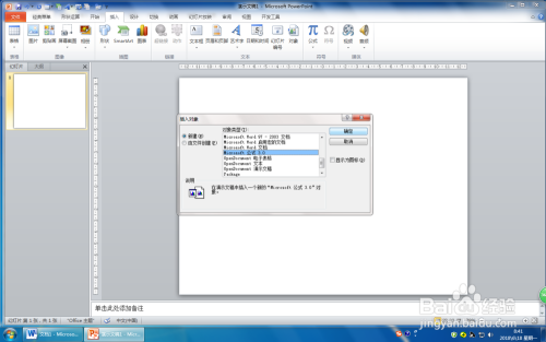 第一步:打开PPT2010,单击“插入”选项卡,在“文本”组中单击“对象”按钮,打开“插入对象”对话框。