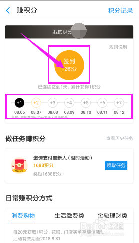 点击【签到】。若是能对峙天天签到,积分就会越高。好比第一天是1分,第七天是7分。间断的话,又会从1分隔始。