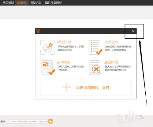 运行OCR文字识别软件,首先它会出来一个页面,这个页面本家儿如果讲解软件的功能特点,临时利用不到,点击退出按钮,退出这个页面。