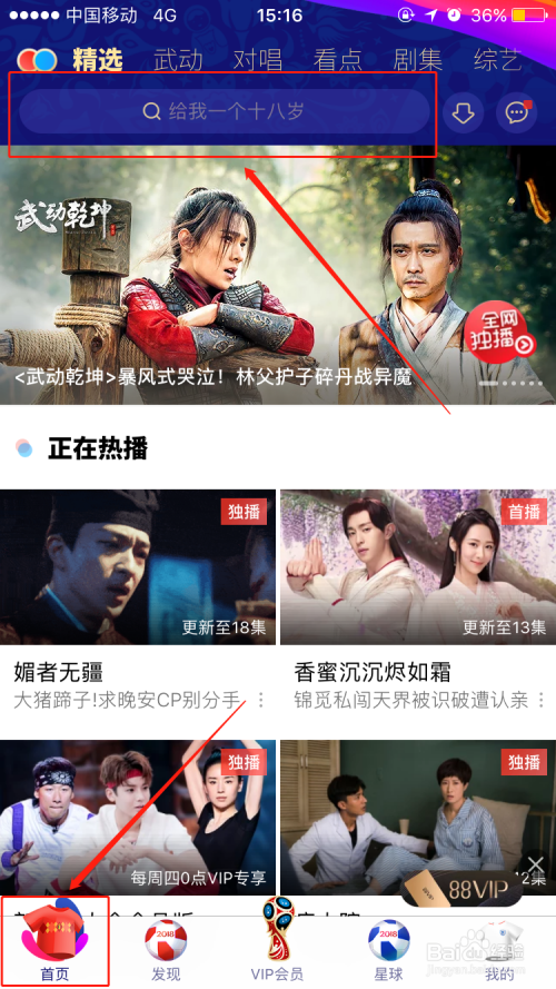 首先我们打开手机优酷APP,进入本家儿界面后,可以看到正上方有一个搜刮栏,我们进行点击