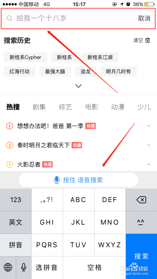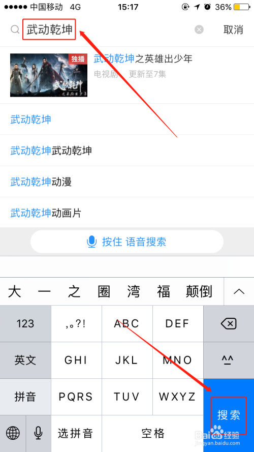 这时屏幕上会弹出手机键盘,在搜索框中输入我们想要看的视频的名称,然后点击【搜刮】选项