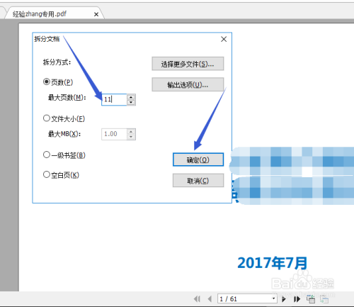 然后弹出对话框,可以设置拆分文件的页数、大小、一级书签和空白页四种选择项,好比小编选择固定页数拆分,每个文件11页,小编的PDF文件总计61页,那么将被拆为5个11页和1个6页的PDF文件。
