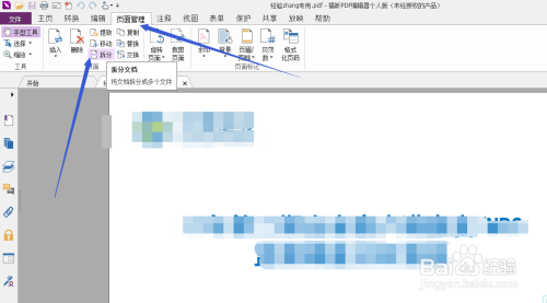 打开需要拆分的文件后,依次点击上方菜单栏中的页面办理>>>拆分,如下图指示位置。