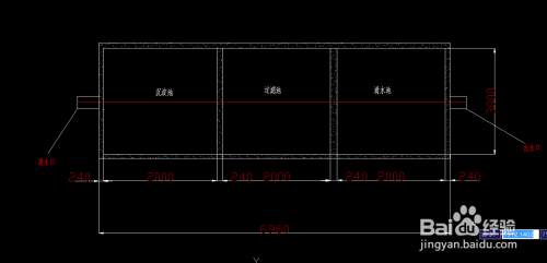 打开CAD,点击画图东西栏中的“矩形”或“直线”按钮,点击“ 正交 ”按钮,绘制三级池(沉淀池、过滤池、清水池)以及进出水口,并进行标注。